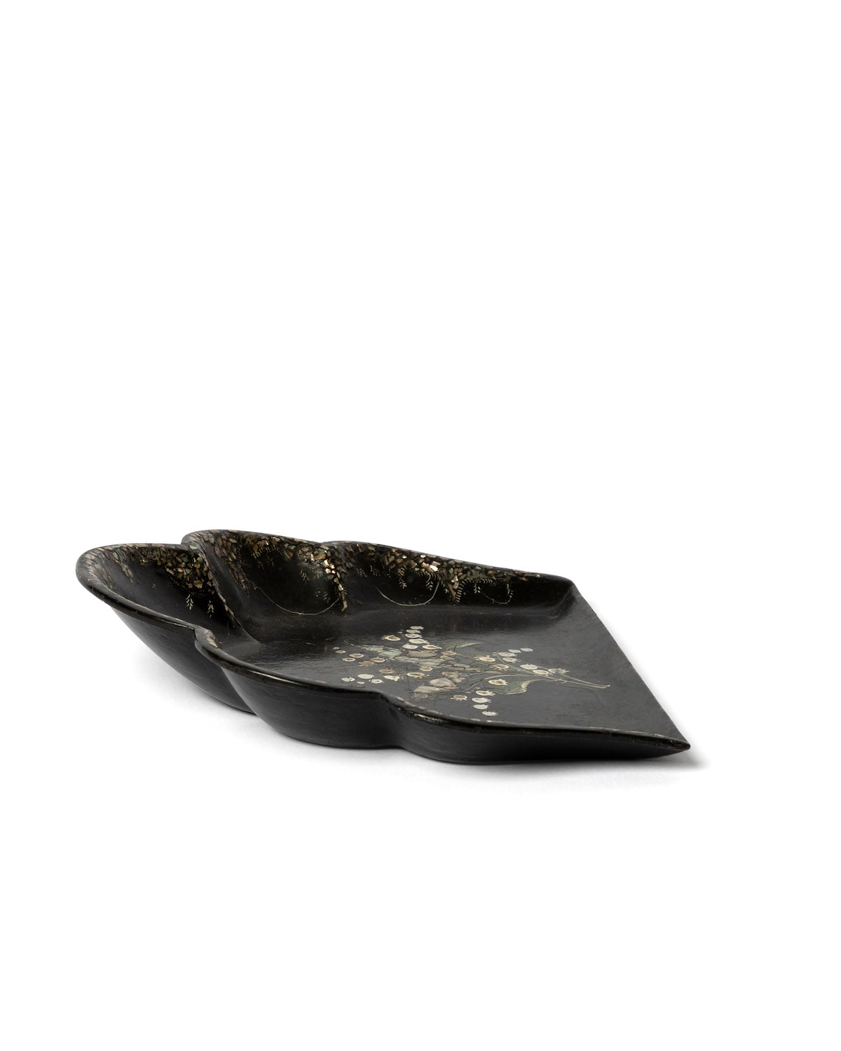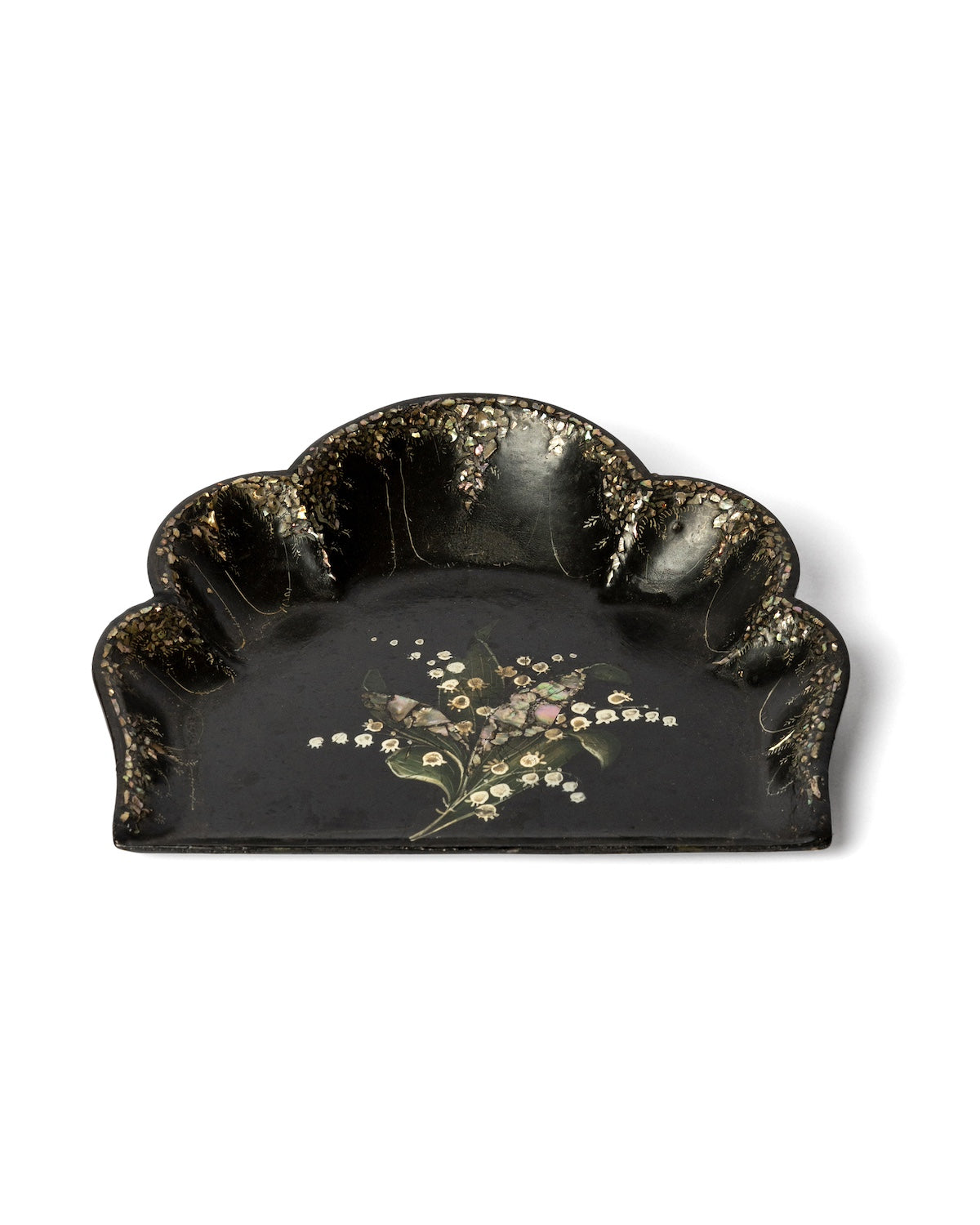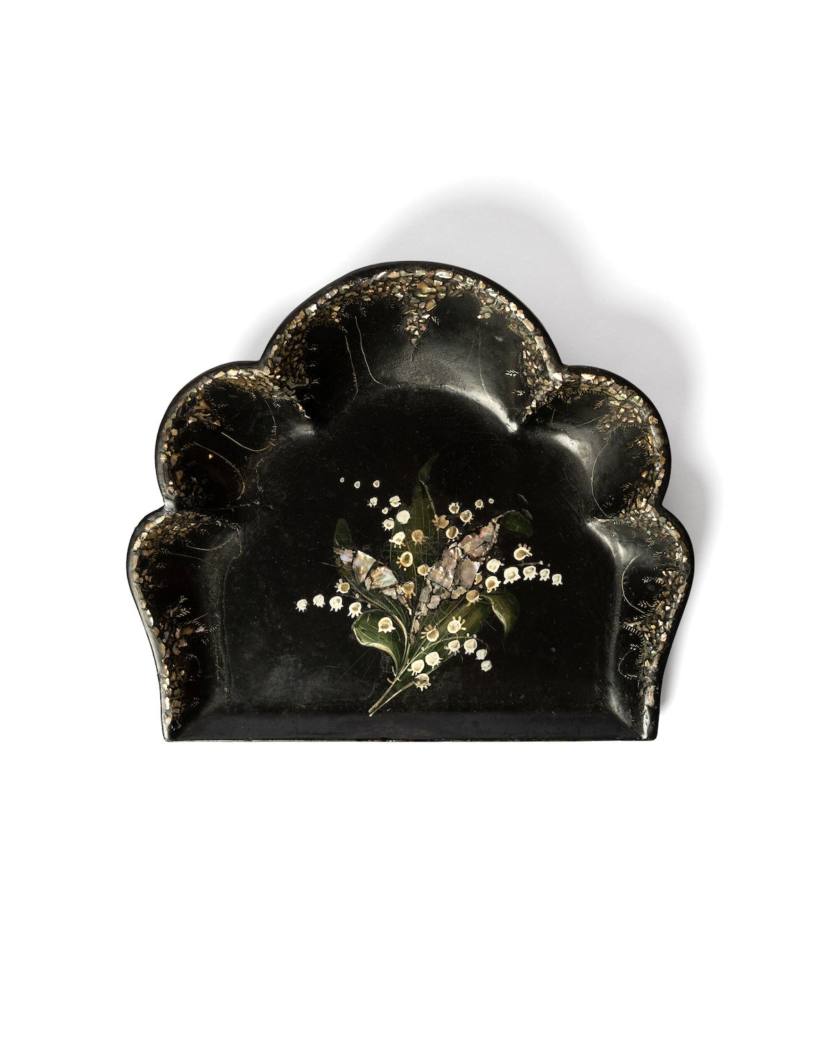 An elegant Victorian catchall with a scalloped edge and mother-of-pearl inlay.