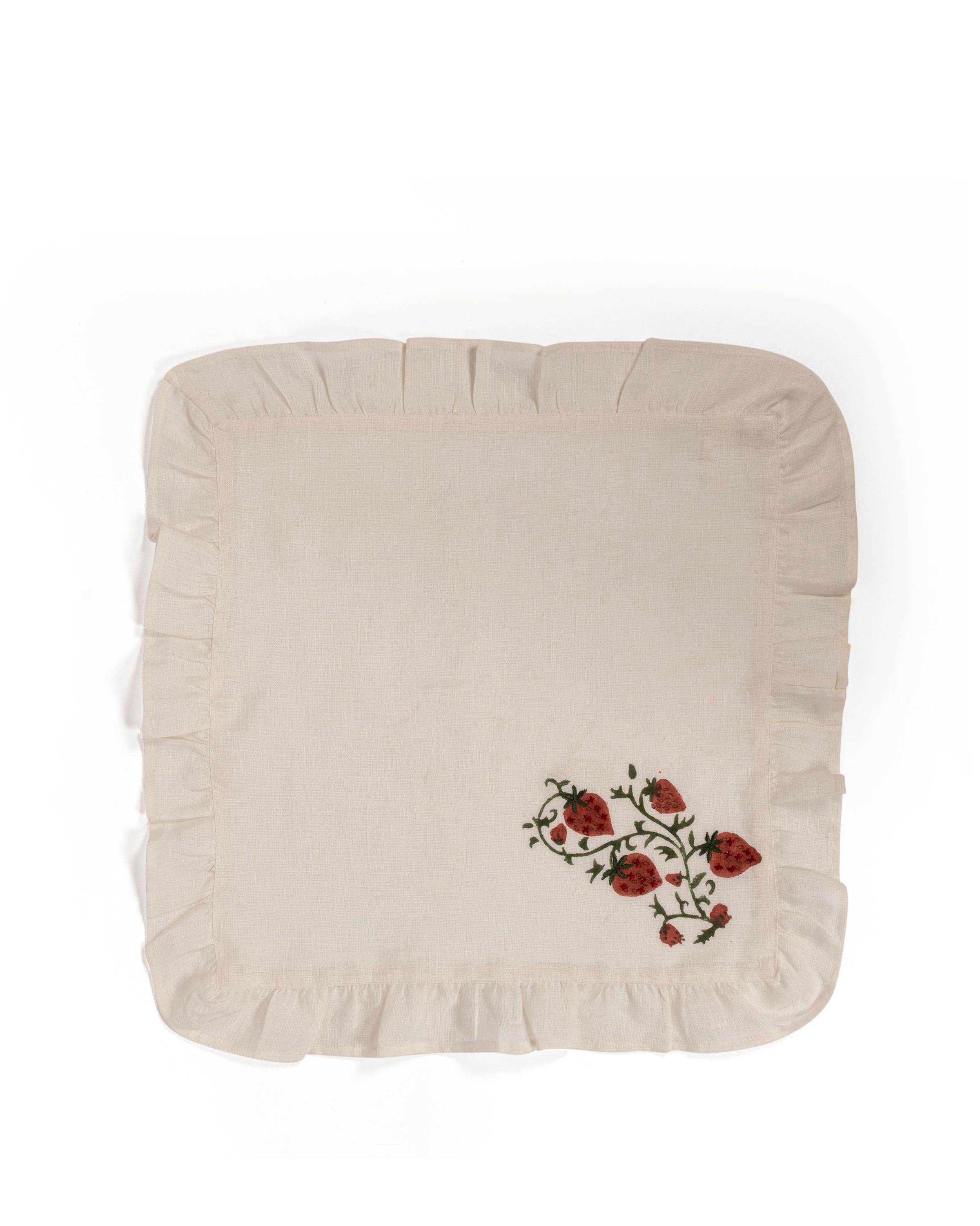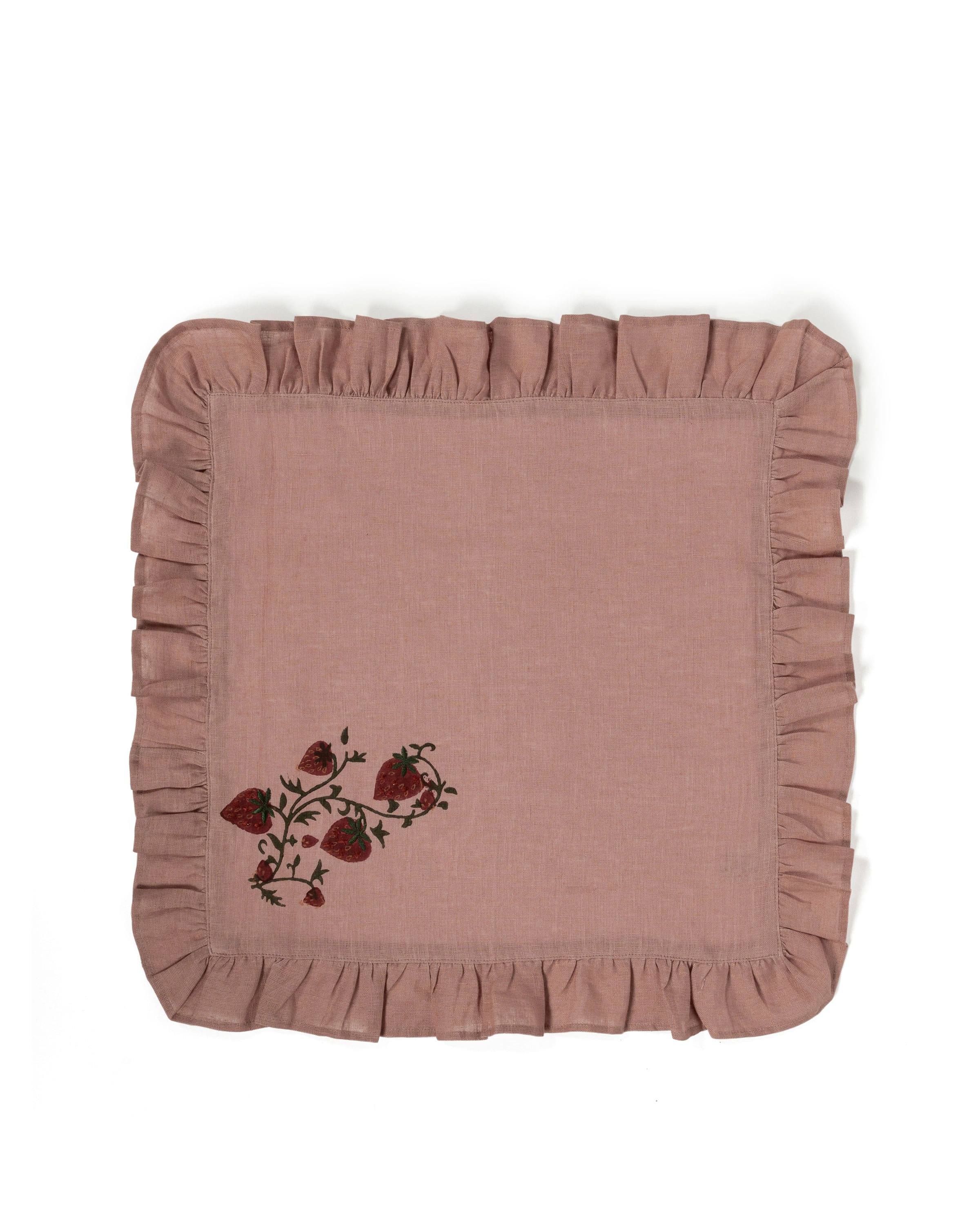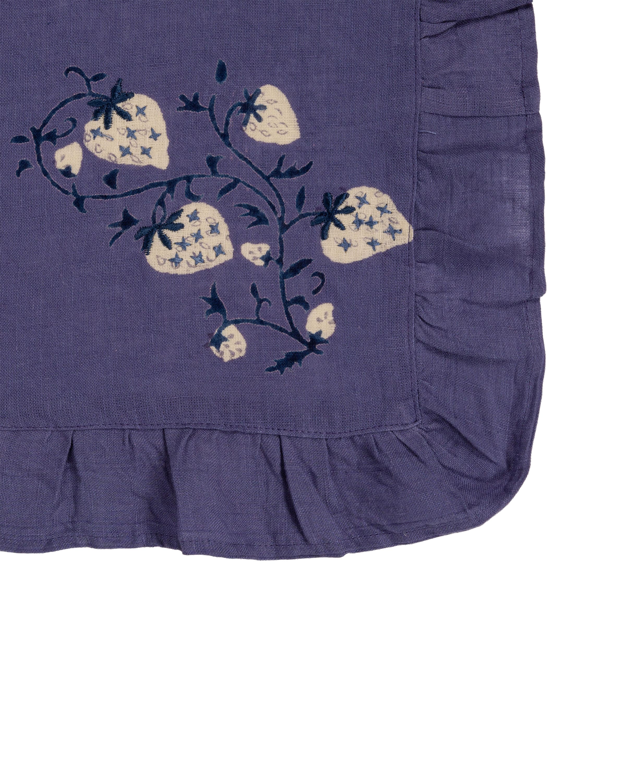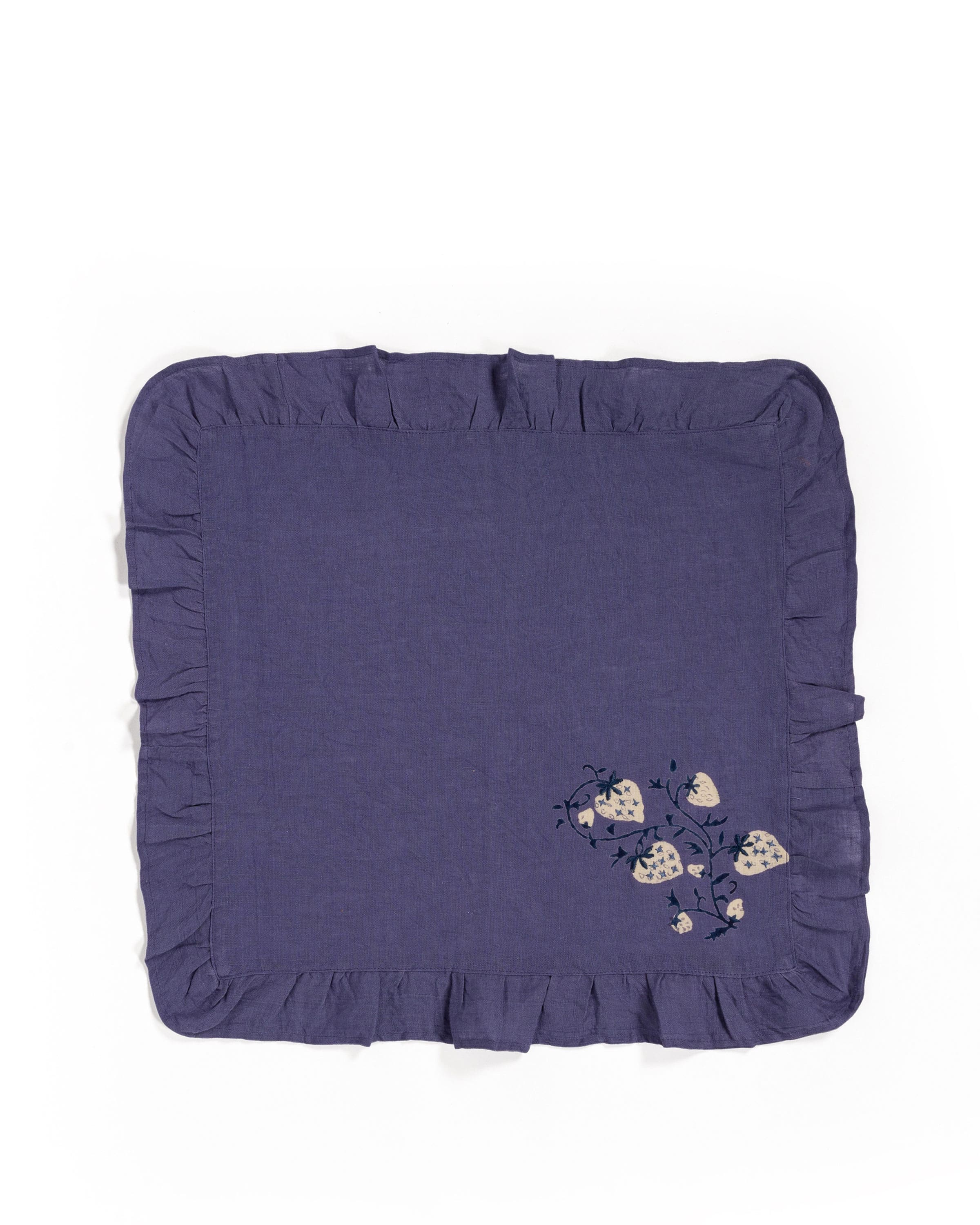 Inspired by a vintage Suzani, our Fraises Des Bois collection features an intricate hand-blocked strawberry motif, layered with hand-cross-stitching. The borders feature a whimsical ruffle, and the whole thing is made from custom hand-loomed linen. This is artisanal work at its finest, and we hope you love the beautiful centrepiece on your table. The Fraises Des Bois napkins come in three colourways: Cornflower Blue, Dusky Pink and Warm White; all are available with matching ruffled tablecloths.