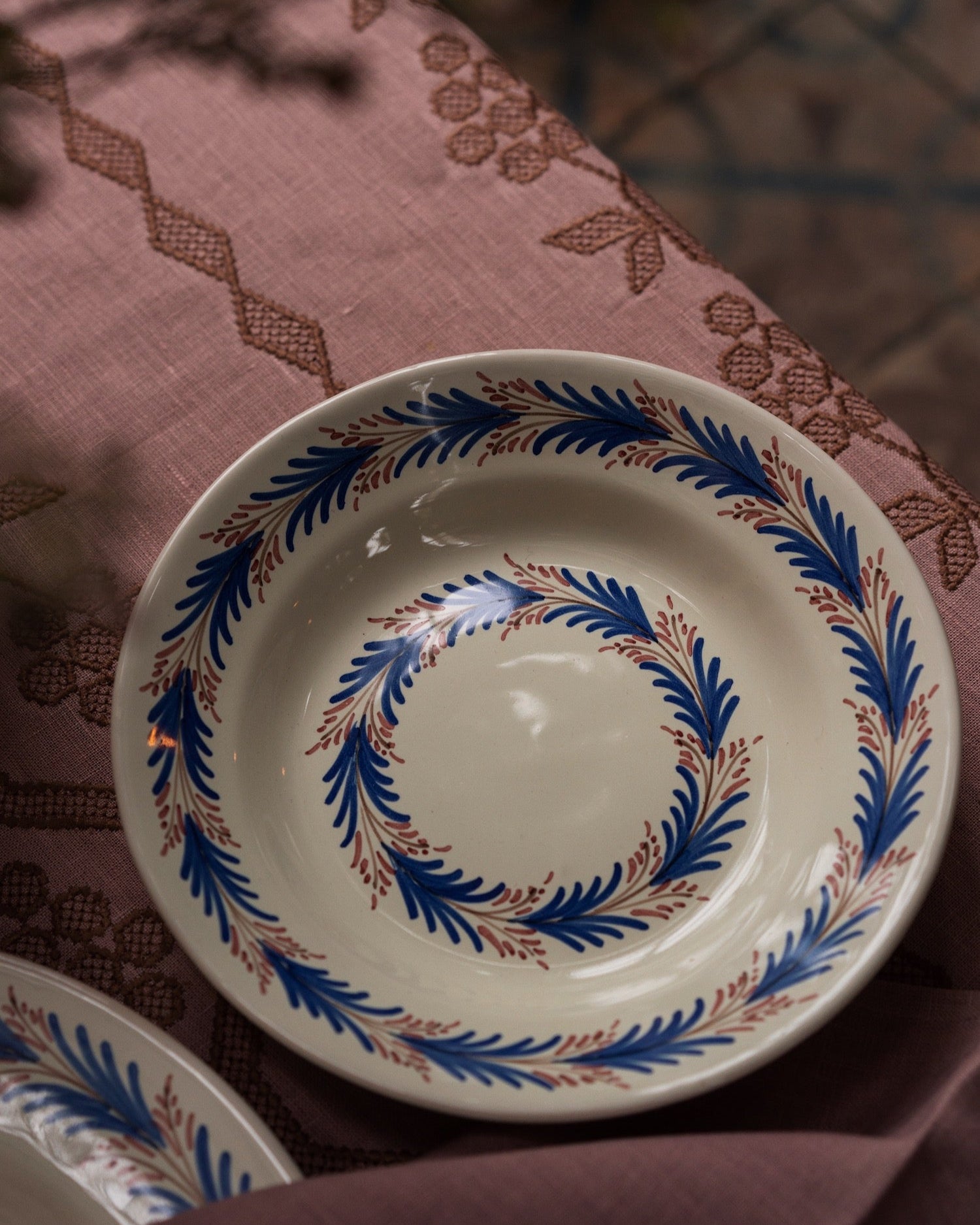 Our Heather dinner plate features an elegant hand-painted floral design, and creates a beautiful tablescape when mixed with the other colourway in this collection. The plates are hand-painted in Spain, and come in two palettes: blue and pink, or pink and tan. Layer them with our Heather soup plates and Vine napkins, in pink.