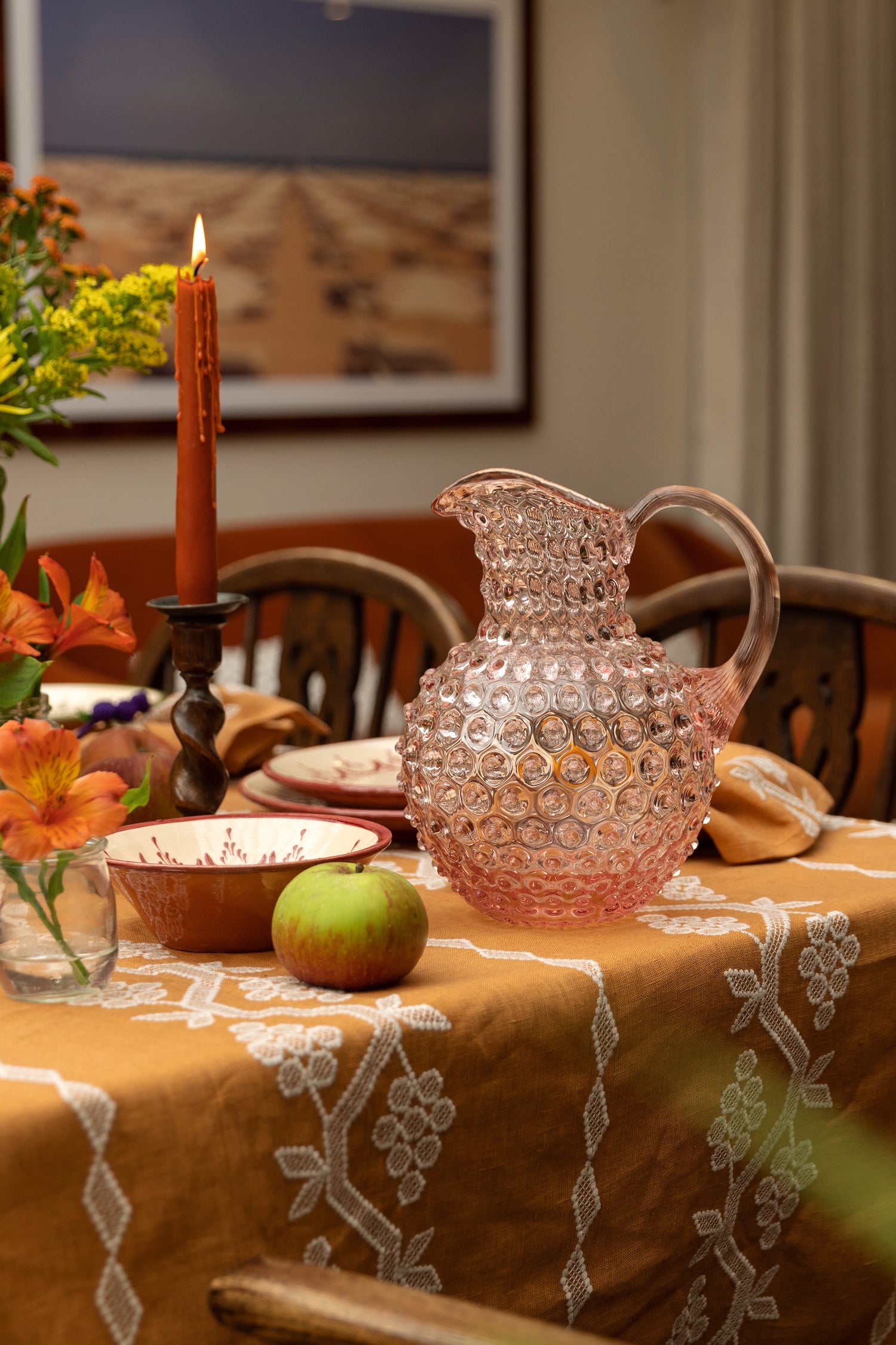 Our round hobnail jugs are mouth-blown, an ancient and intricate technique to create the finest glassware. Available in Clear, Rose pink, Navy blue and Light green, these pitchers make the most elegant addition to your table or your bar cart.
