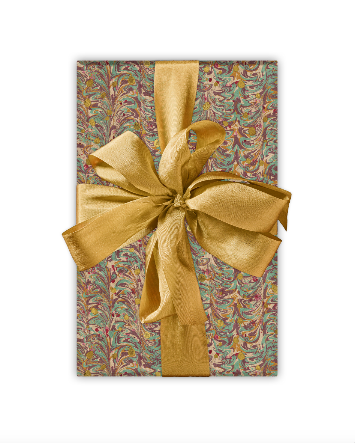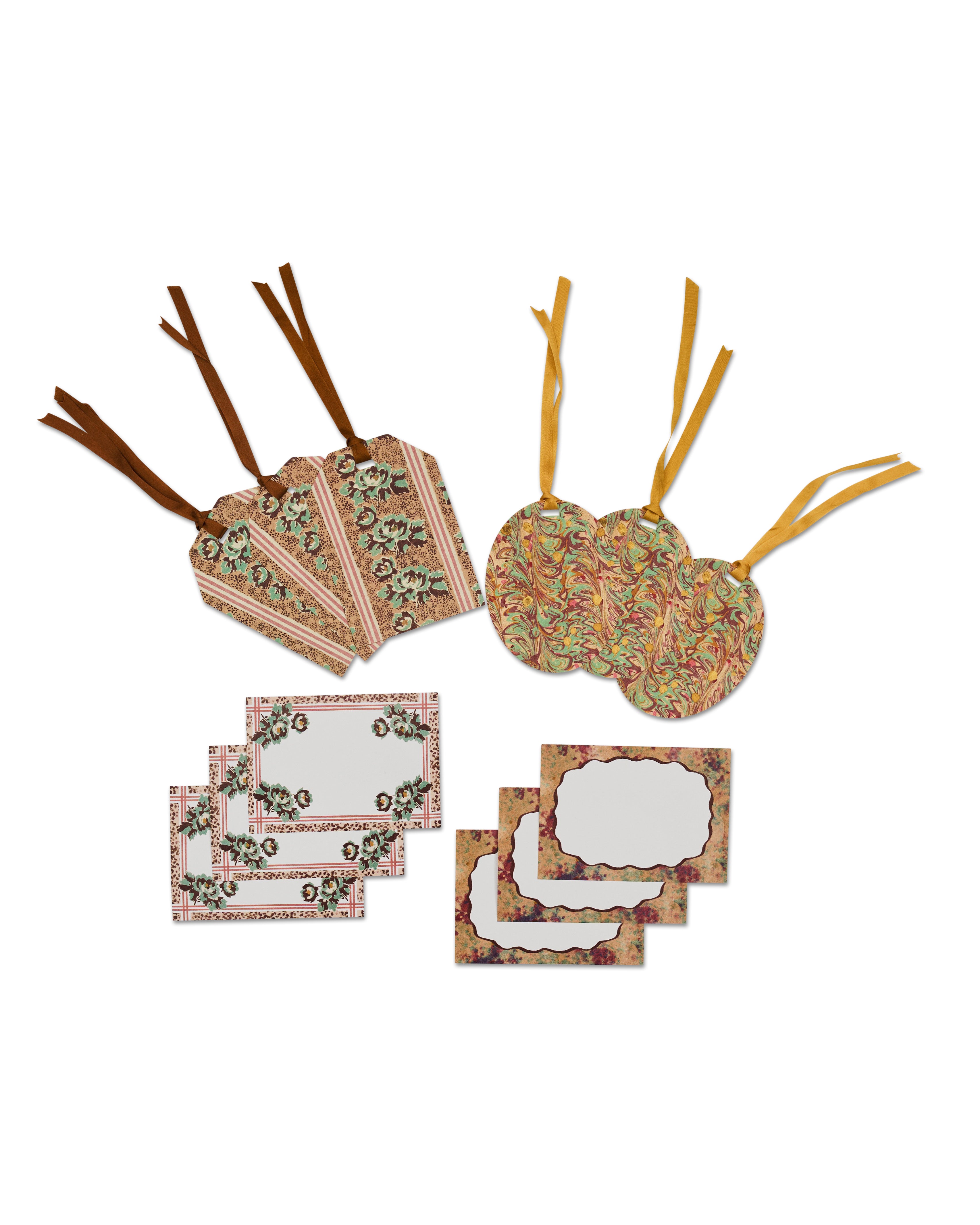 Set of 6 Wrapping Paper Sheets (2x Tea Rose, 2x Mottle, 2x Marble), Set of Gift Tags (6x each) & Adhesive Labels (6x each), Ribbon (3m Caramel + 3m Buttercup).