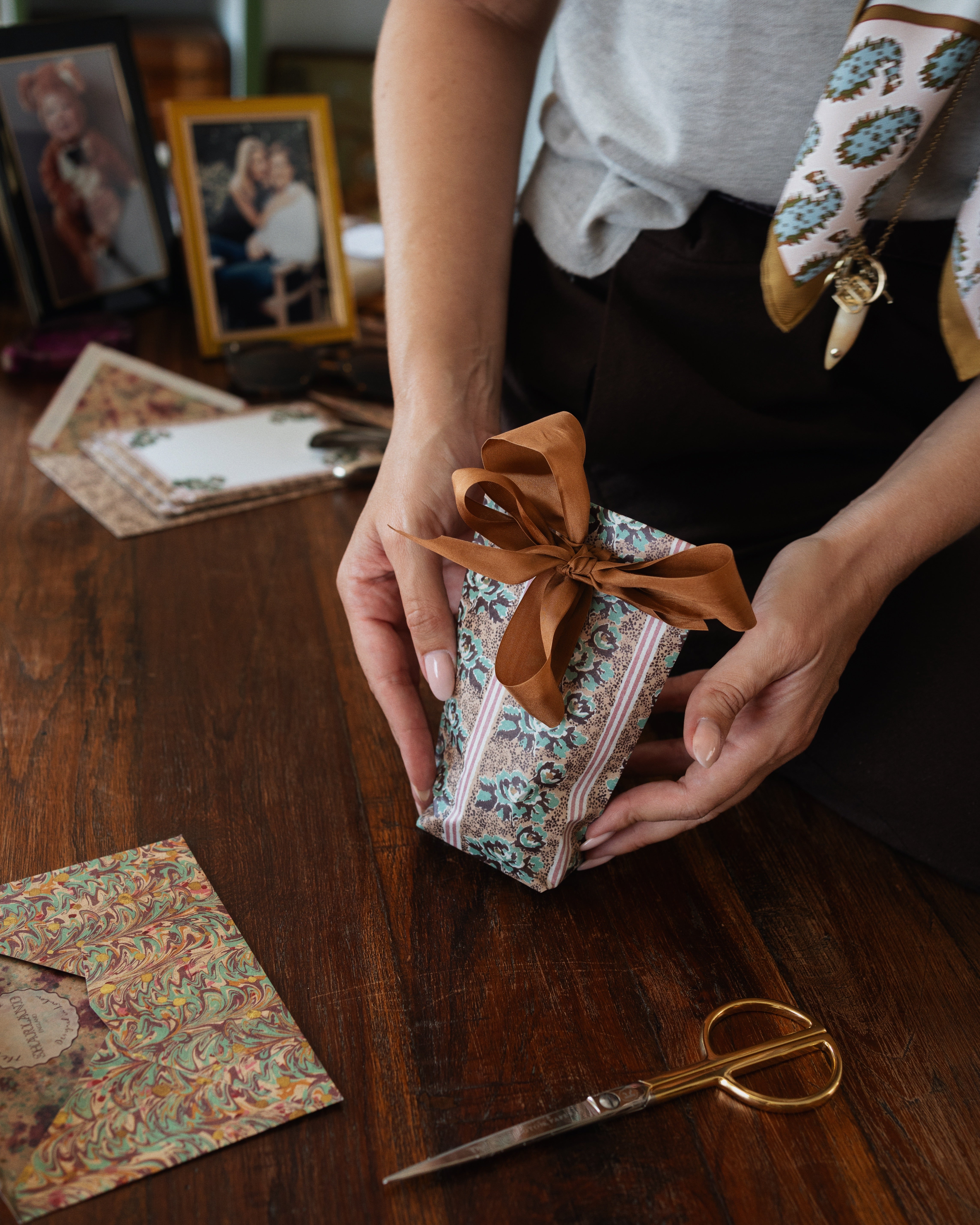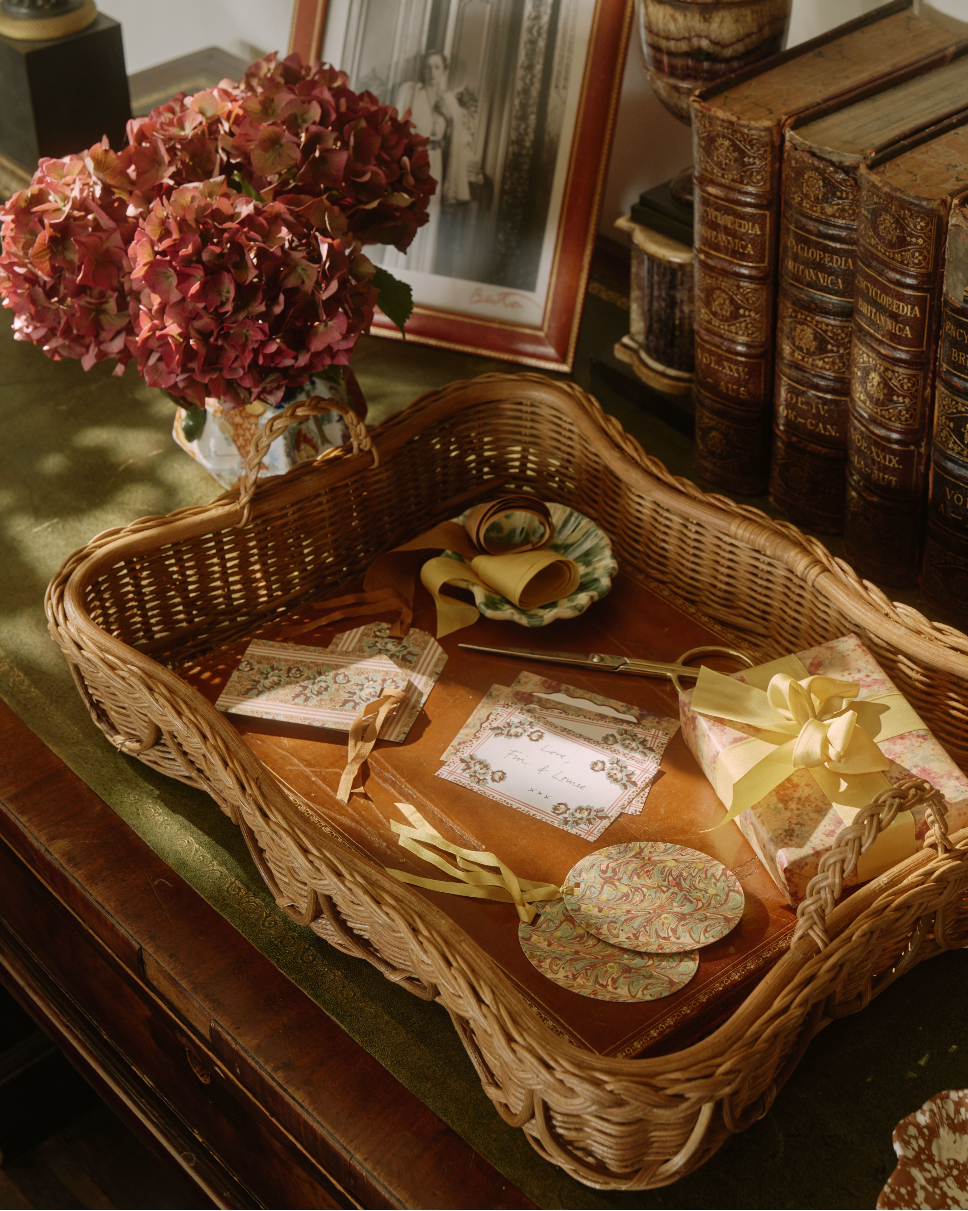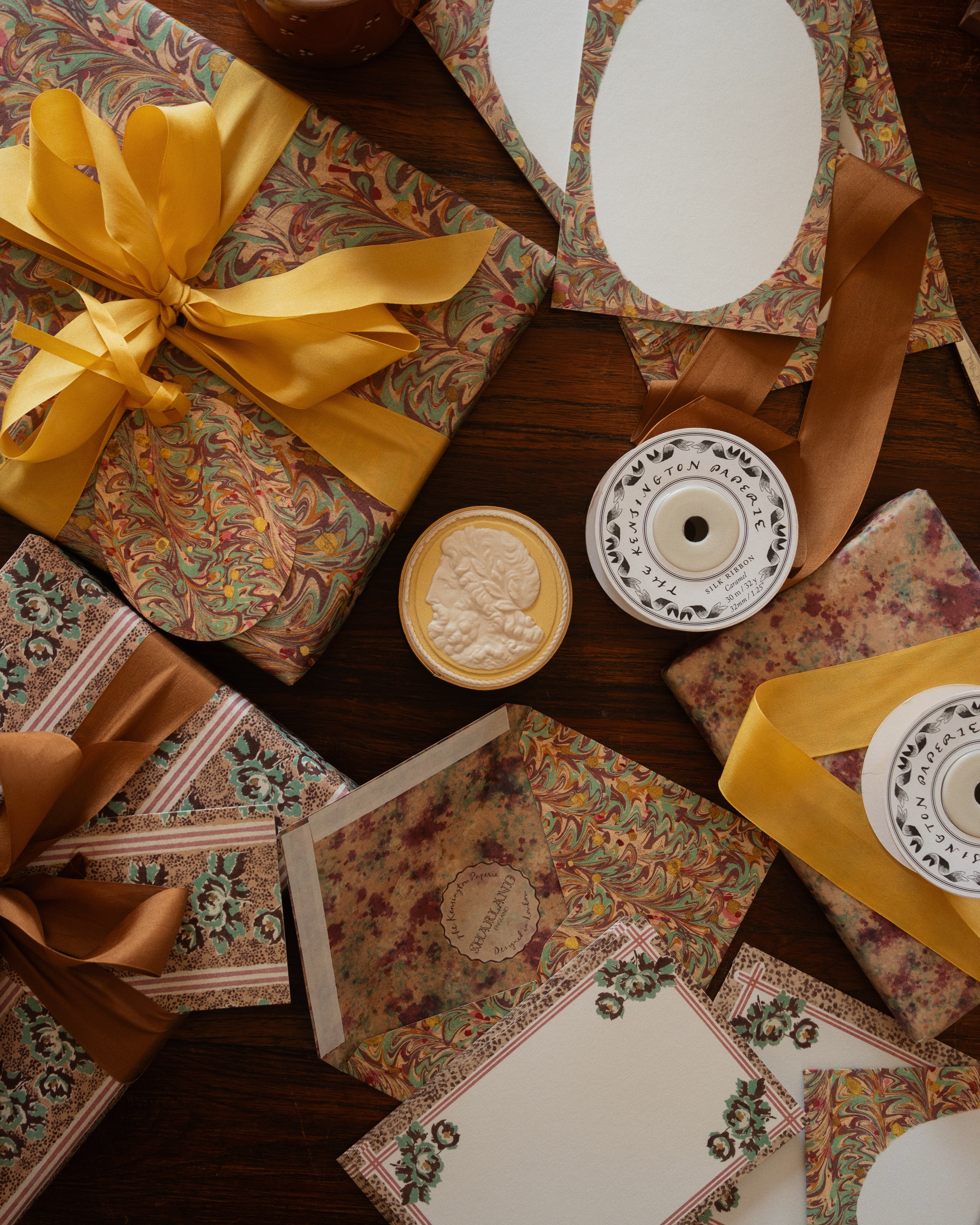 We are thrilled to present our limited edition stationery collection with The Kensington Paperie. Both Sharland England & TKP's founders have been friends for decades, coming together to create beautiful items, from wrapping paper & silk ribbon, to thank you notes, gift tags & bags. Designed and printed in England, this set includes our wrapping paper (in all 3 designs), our Ribbon (3m of Caramel & 3m of Buttercup) plus our gift card & adhesive label set (6 of each).